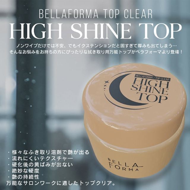 ノンワイプだけでは不安、でもイクステンションだと固すぎて厚みも出てしまう、 そんなお悩みをお持ちの方にぴったりな拭き取り用万能トップがベラフォーマより登場。 ・様々なふき取り溶剤で艶が出る ・流れにくいテクスチャー ・硬化後の黄ばみが出ない ・絶妙な硬度 ・艶の持続性 万能なサロンワークに適したクリア。 ・拭き取り必要 ・コンテナタイプ